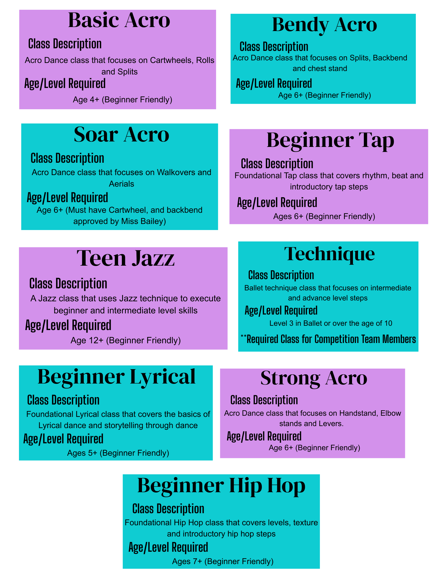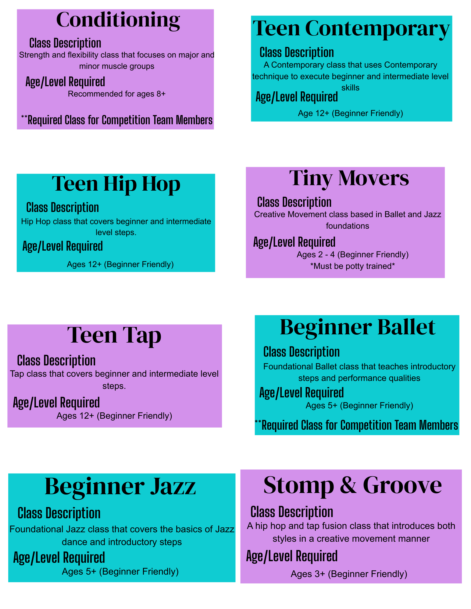 We offer innovative classes in a variety of genres such as Contemporary, Jazz, and Musical Theatre, as well as more traditional classes in Ballet and Tap. Our owner is a passionate dance educator who provides students with the basic skills they need to go on and express themselves fully in the dance style they prefer. Dancers of every level of experience and skill are invited to our classes and our competition team. We are also thrilled to welcome dancers with physical limitations or disabilities.