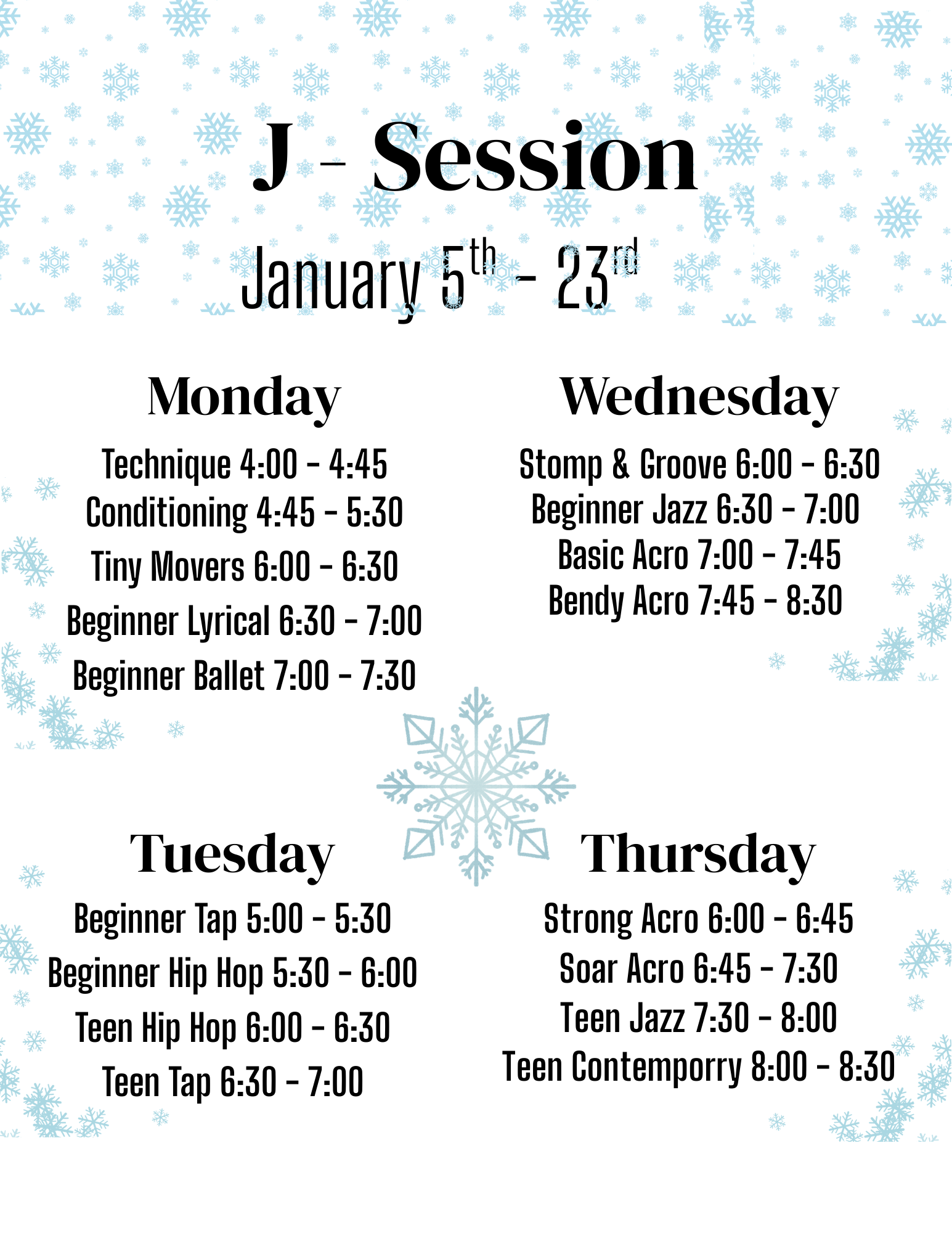 We are excited to offer J-Session with so many class offerings! J-Session will start on a Monday, and will last three weeks long.