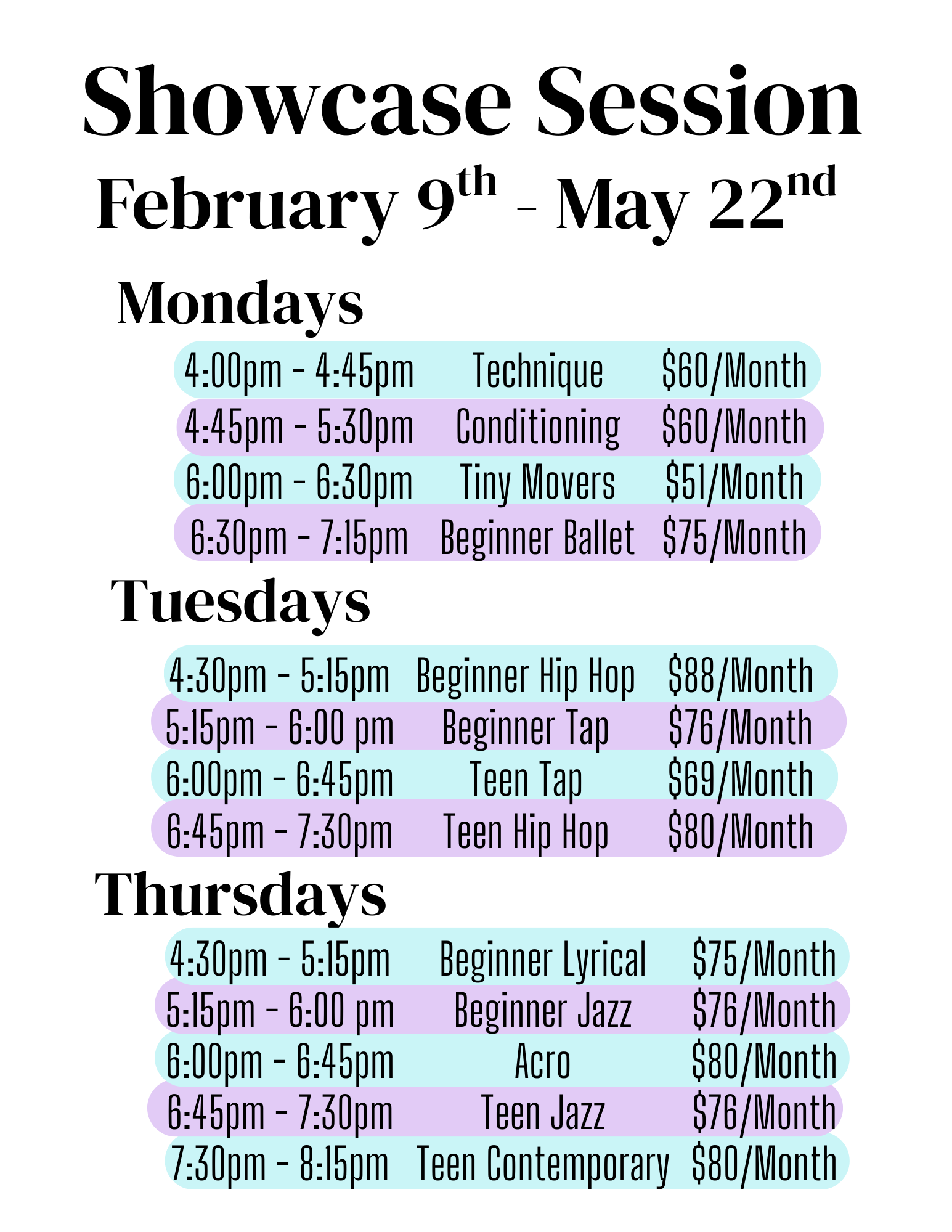 We have been working hard planning our 2nd Annual Showcase! Come dance and perform with us! Cost in below picture include the cost of costumes broken down into the monthly cost.